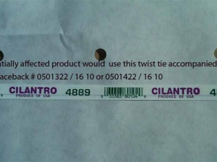 Consumers should be aware that the cilantro bunches do not contain identifying lot codes. Each bunch is sold with a distinctive, but general twist-tie for cilantro. Samples of the four relevant twist ties are pictured below.