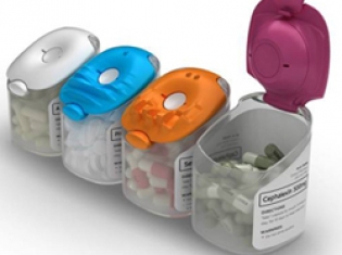 Most interesting is that the pill bottle offers a distinctive texture on the lid that can be used to identify medication. Eight different textures have been developed. Lids also will feature dark, dramatic color, aiding those with limited sight in identifying drugs.